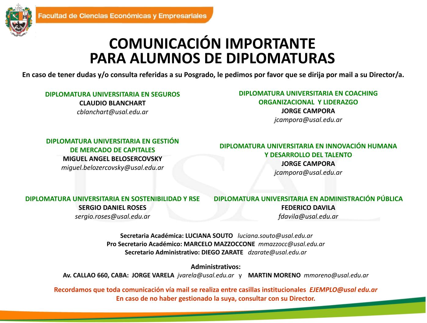 * Posgrados (todos), Administración de Recursos Humanos, Administración y Comercialización: Lorena Morsella lmorsell@usal.edu.ar